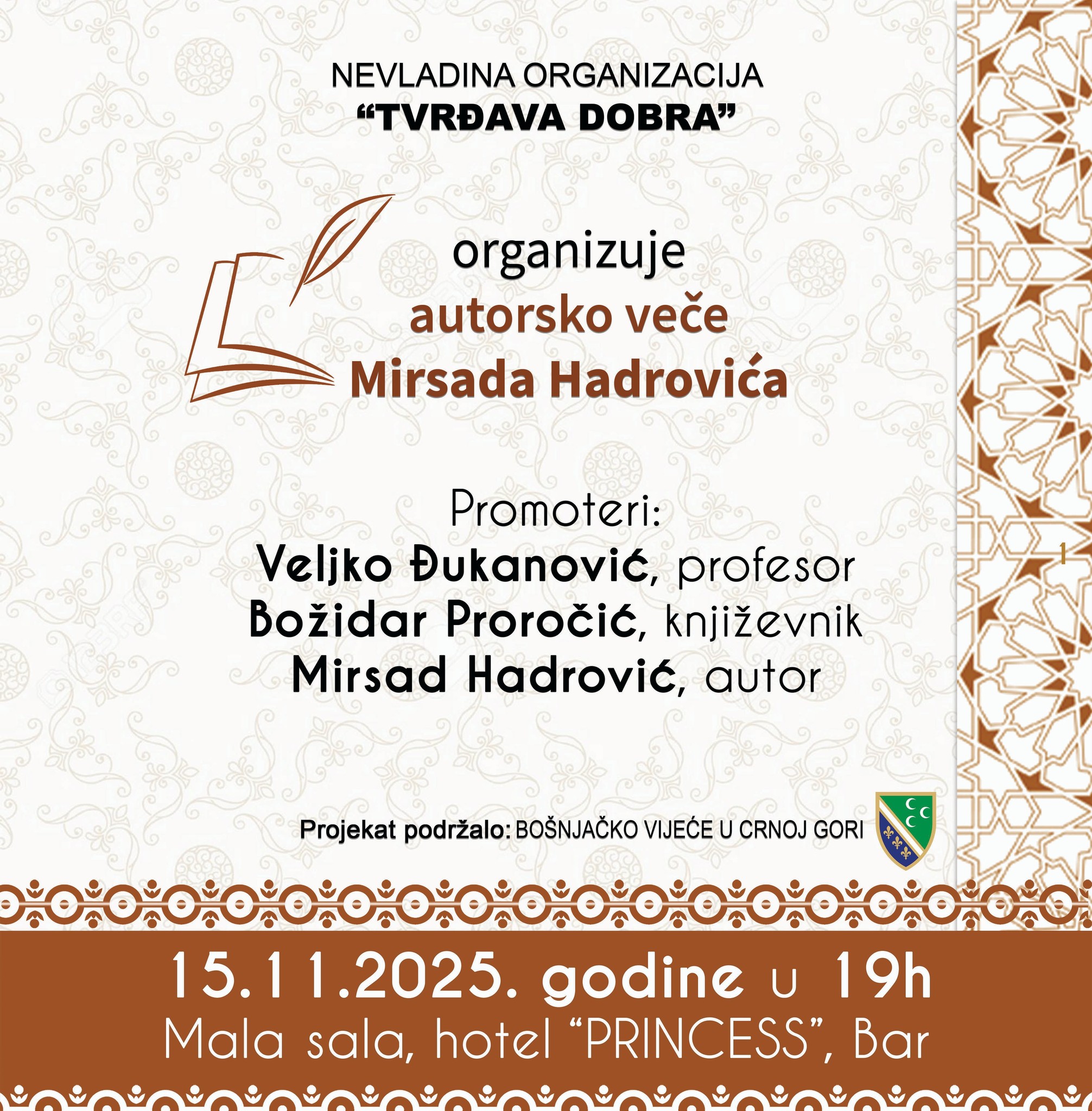 Nevladina organizacija „Tvrđava dobra“ organizuje autorsko veče Mirsada Hadrovića u subotu, 15. novembra 2025. godine, od 19.00 časova, u maloj sali hotela „Princess“ u Baru.